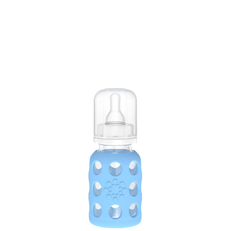 The perfect starter bottle for baby. The Lifefactory 4oz borosilicate glass baby bottle comes with a silicone sleeve, polypropylene cap, ring, and stopper, and a Stage 1 (0-3 months) silicone nipple. These are wonderfully easy to clean: the bottle stays inside the silicone sleeve, and go right in the dishwasher. You'll love these neat little bottles as much as your baby does!