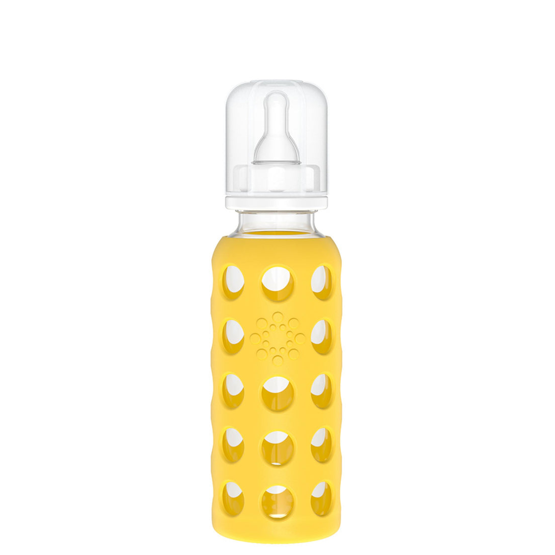 As baby grows the Lifefactory 9 oz borosilicate glass baby bottle is the next step up. With a variety of nipple sizes and sippy caps our bottle adapts to your baby's changing needs. The 9 oz. bottle comes with a silicone sleeve, polypropylene cap, ring, stopper, and a Stage 2 (3-6 months) silicone nipple. With the grippy surface of the colorful silicone sleeve, these bottles are easy to grip and easy to love.