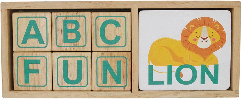 The ABC Spelling Block is both a great first block set and an alphabet & spelling toy all in one! Teach letters, basic spelling, and learn to identify and spell 40 objects and animals all with this simple elegant block set. This beautiful wooden toy set includes 6 alphabet blocks and 20 double sided cards featuring fun objects, animals, and more. Infants will love playing with the blocks and as your child ages the toddler and preschool learning will let this toy grow with your child. Kids will love the blocks and parents will love how many different ways they can play. Great play value and even better planet value, this toy set features sustainably harvested rubberwood and is finished with non-toxic, child-safe water based stains. Perfect for 2+