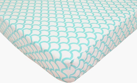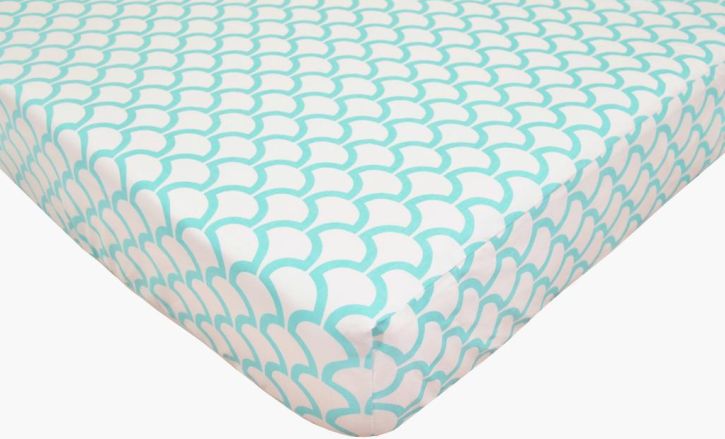 The American Baby Company Aqua Seawaves Percale Crib Sheet are 220 thread count and made of 100% cotton