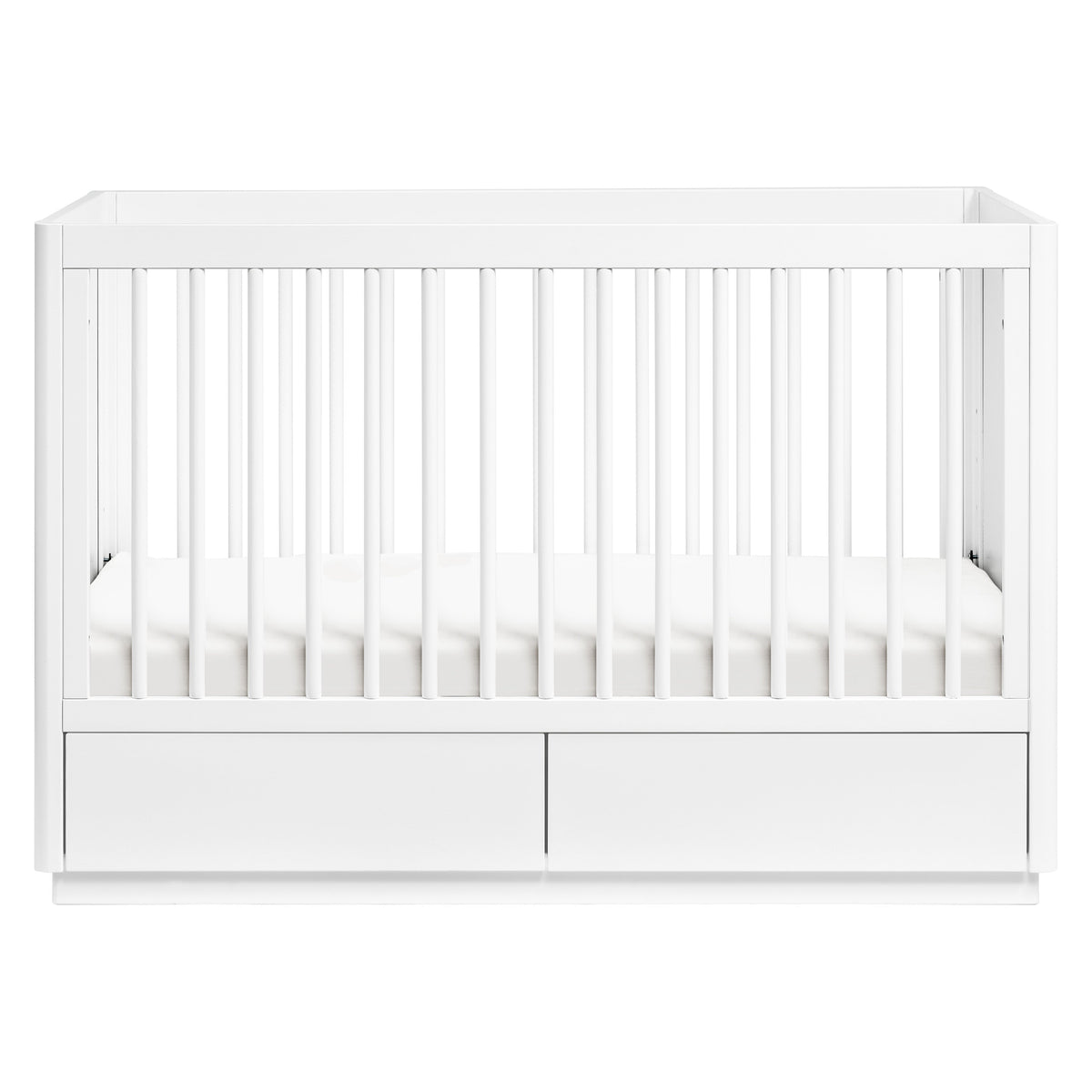 - CLEAN MODERN LINES: Smart and stylish modern storage crib with two separate drawers featuring hidden drawer pulls, softly curved edges, and a raised platform base