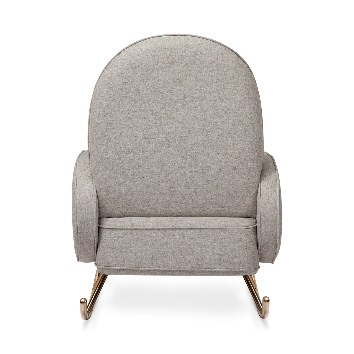The Compass rocker is at once a study in geometry and a place for luxurious repose as its cushions are plush, yet supportive and its rose gold curved legs ensure a free-flowing rocking. Hand upholstered in smooth eco-performance fabric, that is stain resistant, water repellent, and made with at least 30% recycled materials.
