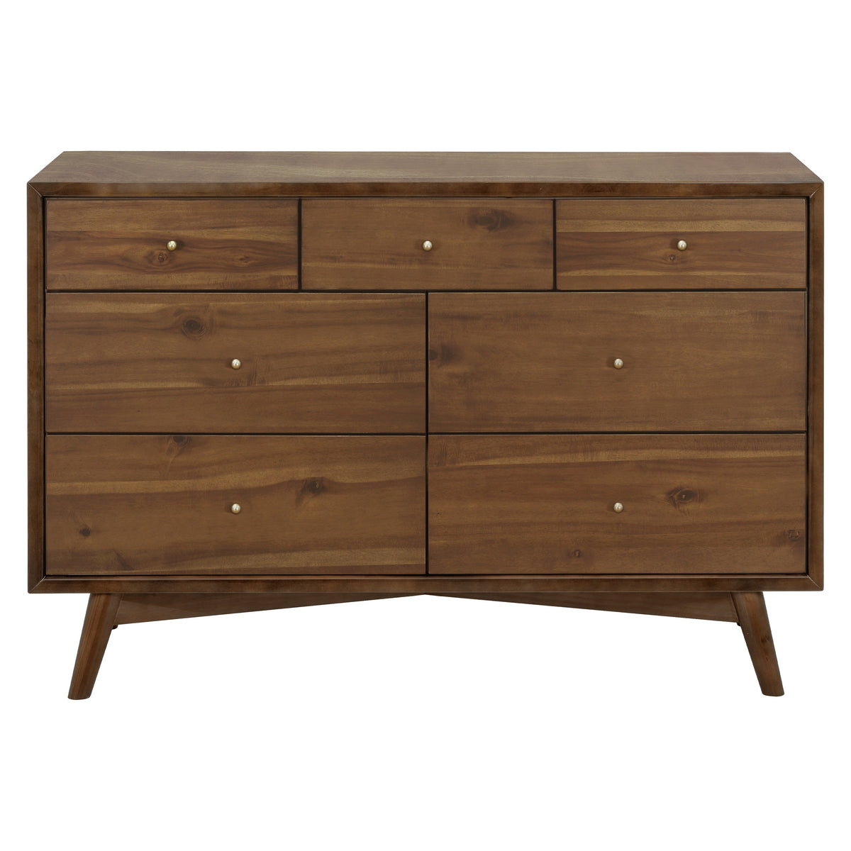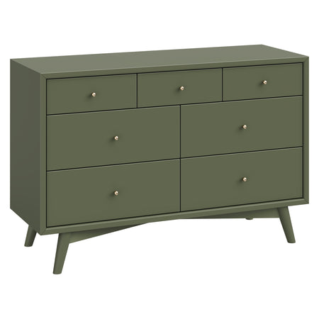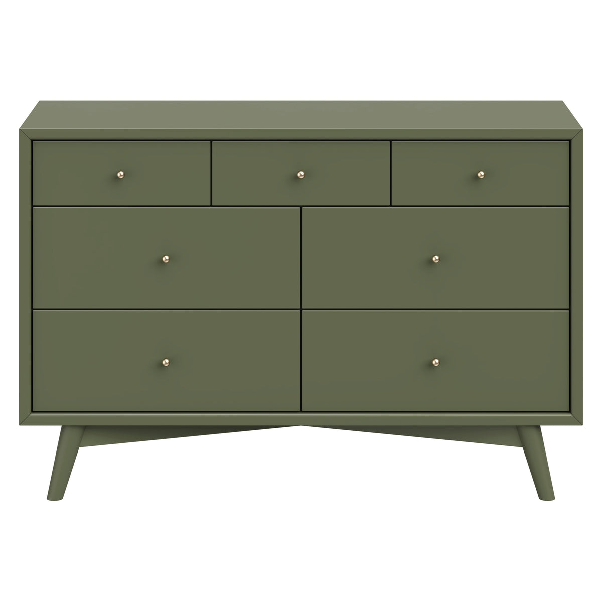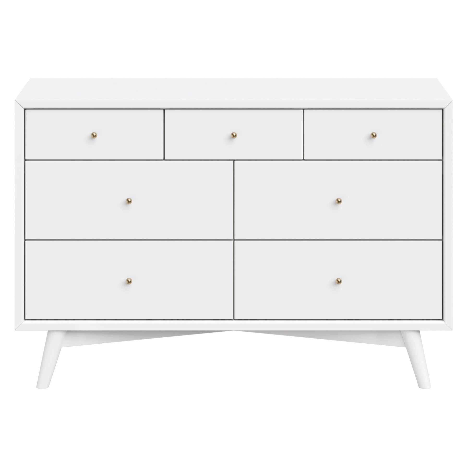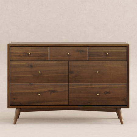 The Palma 7-drawer Double Dresser is a sophisticated mid-century inspired design with contrasting walnut stained drawers, tapered legs, brushed metal hardware, and smooth-glide drawers. It's a versatile modern piece, providing ample storage space with three top drawers and four larger bottom drawers. Pair with the Palma 4-in-1 Crib or Peggy 3-in-1 Crib for an elegant nursery.