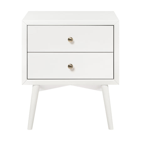 The Palma Nightstand with USB port and is a sophisticated mid-century inspired design with tapered legs, brushed metal hardware, and two smooth-glide drawers. Easy setup with minimal assembly required.