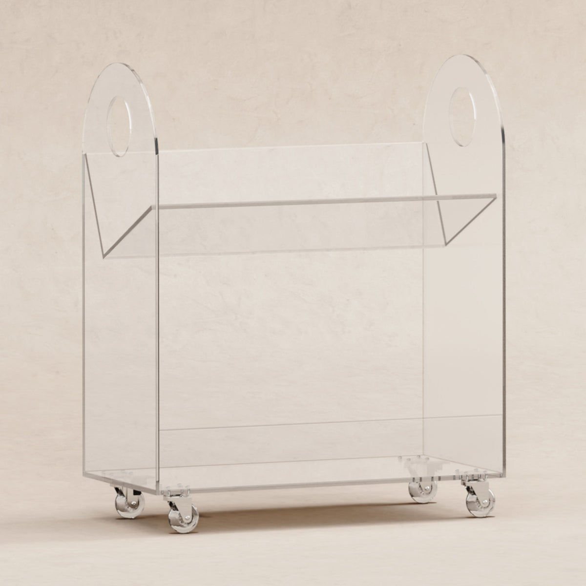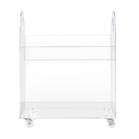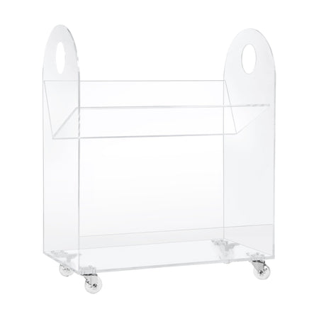 - Made with 100% clear recyclable acrylic lucite and clear wheels with locking casters (on back wheels) for safety