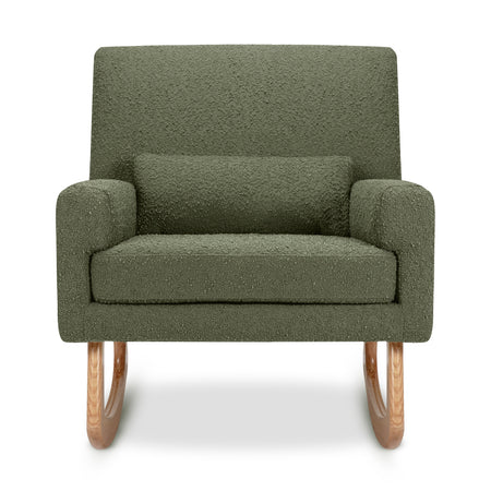 The well-balanced Sleepytime Rocker is lightly padded and finely upholstered with a fitted back using a subtly textured boucle fabric. Ash hardwood legs allow for a smooth rocking motion.