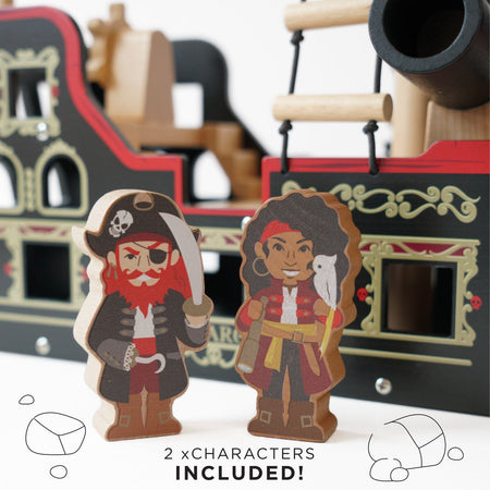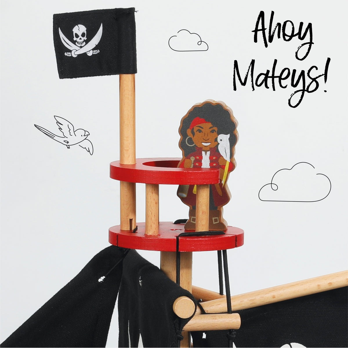 Set sail for swashbuckling adventures with the magnificent Barbarossa pirate ship with characters. All aboard this classic, award winning wooden toy boat. Painted in striking black, with billowing fabric sails and adorned with a traditional skull and crossed swords motif for an authentic look and feel. Full of fun features to discover, this highly detailed toy is crafted from durable wood, built to last and sustainably sourced for eco friendly play. Jam packed with a host of exciting, interactive features to discover including a crow's nest, 'walk-the-plank' element, rigging, a spring loaded firing cannon with cannonballs, wind-up anchor, trap-door and a rear opening stern for access. This plastic free toy makes a special gift, for inspired adventures that last a lifetime of play.