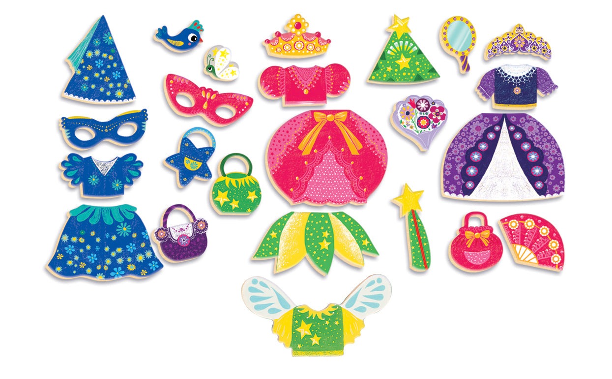 - Contents: 1 princess-shaped metal box and 24 magnetic wooden pieces.