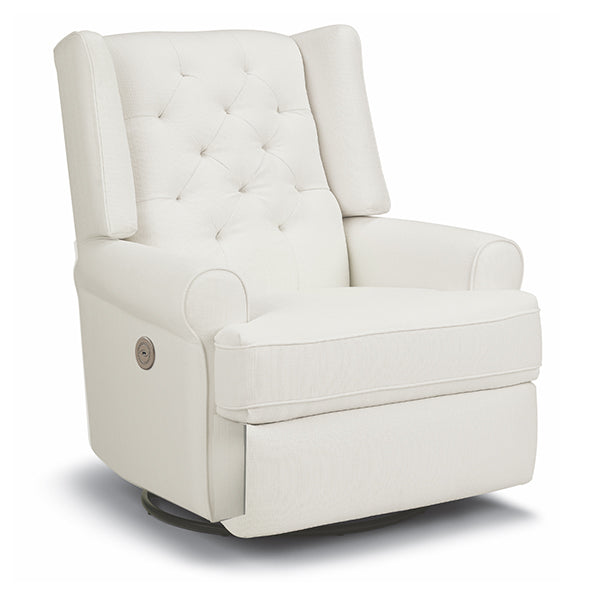 Style meets comfort with the Best Chairs Kendra Power Swivel Recliner - 21557 Snow. The fine, made in the USA tailoring is evident with the button tufted back, clean lines, and updated wing back. The size and styling make this recliner ideal for the living room, bedroom, den, or nursery. The gliding base with a 360-degree swivel feature is a functional and relaxing detail. With all these finer points, Kendra keeps one big secret. An inside reclining handle! Kick your legs up after a long day, and recline back for much-needed rest. The Kendra Power Swivel Recliner offers deluxe comfort with a stylish Power button that features a USB charging port.