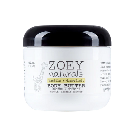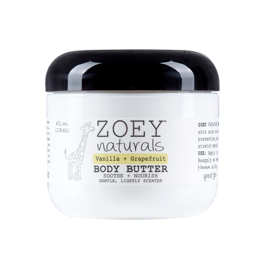 Our Zoey Naturals Body Butter is great for dry, irritated skin such as cradle cap and also assists in preventing and minimizing the appearance of stretch marks. Naturally scented with sweet notes of vanilla and refreshing pink grapefruit.