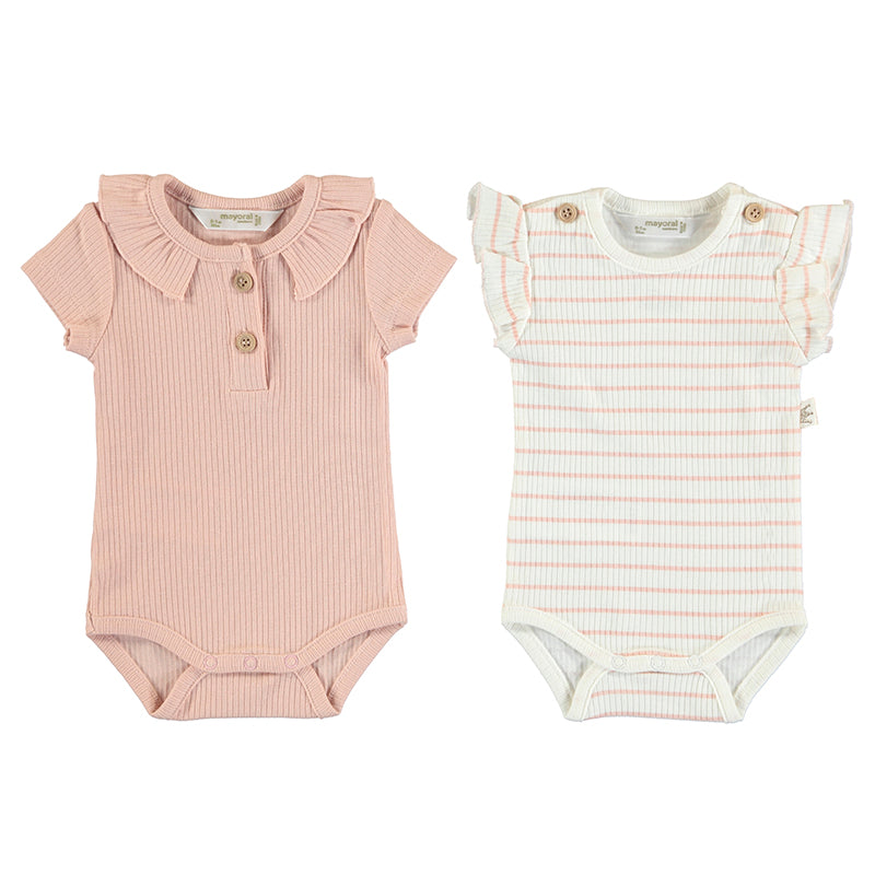 ECOFRIENDS garment, contains sustainable cotton Short sleeved Bodysuits with ruffled detailing for newborn girl. Round neckline. Snap button closure at crotch for easy putting on and taking off. Button fastening on both shoulders. Due to the characteristics of the fabric, this garment does not need to be ironed.