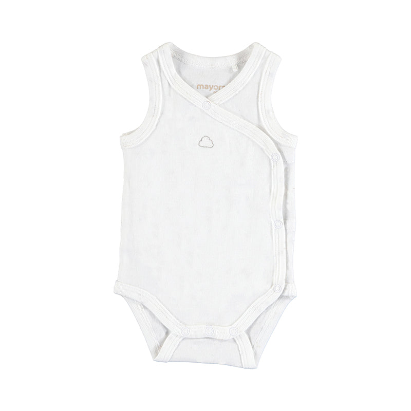 ECOFRIENDS garment 100% sustainable cotton. Short raglan sleeve Bodysuits for newborn boy. Crossover neckline and full side slit that closes with snap buttons to make it easy to put the bodysuit on. In the larger sizes (from 4-6 to 18 months) the side fastening is replaced by an opening at the shoulder.