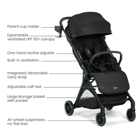 You can't wait to experience all the sweet moments of parenthood – from cozy cuddles to toddler giggles. But you also know that between those tender memories, life as a parent can get hectic. When you’re on the go with your little one, you won’t want to be hauling around heavy, cumbersome gear. With the Juniper™+ compact stroller, you won’t have to. Featuring a lightweight and portable frame, an effortless fold-and-go design, and infant car seat compatibility, the Juniper+ compact stroller is made to fit smoothly into your growing family’s routine from day one. When your little one arrives, you can easily convert Juniper+ into a newborn stroller by pairing it with select Britax® infant car seats (adapters required; sold separately). As your days get a little busier and your hands get a little fuller, Juniper+ helps you keep up with the pace of parenting with the FastPack™ system, allowing you to fold, grab, and go without stopping. FastPack includes one-hand RapidFold™, a bumper bar that converts into a built-in carry handle, and a storage pocket that keeps your belongings secure and accessible even when the stroller is folded. This lightweight travel stroller also includes a self-retracting carry strap for convenient, hands-free portability — because you’ve got enough to juggle. With all-terrain wheels, extra ventilation, an expandable UPF 50+ canopy, and a parent cup holder just for you, Juniper+ will soon become your go-to, on-the-go stroller.