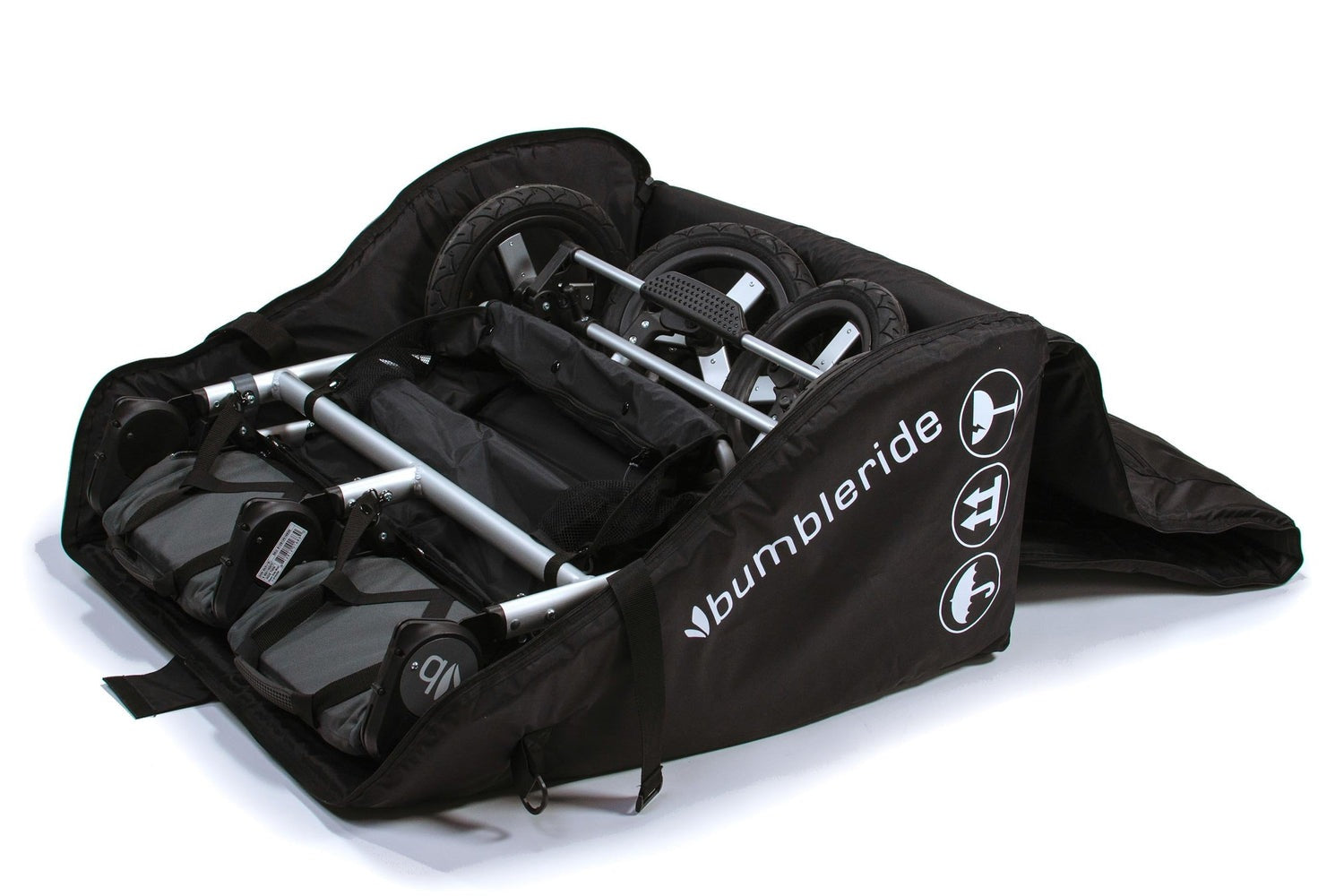 The Bumbleride Indie Twin Double Stroller Travel Bag will ensure Indie Twin’s safe and clean arrival to your destination. There’s no need to remove stroller wheels thanks to dual-zippered sides and a large center opening, making packing up or unloading quick and easy. An inner security belt, 3 exposed luggage wheels and a footed base make for quick maneuvering through tight spaces or upright stow.