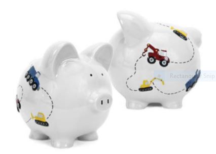 Introducing the Child to Cherish Construction Piggy Bank, White. All of our banks are made from only the highest quality ceramic, known as dolomite, for increased durability. They feature a base that is deep glazed, insuring that this essential color doesn’t wear off with repeated handling. To finish things off, we add a shiny finishing that keeps the colors of all of the underlying components locked in place, meaning that you never have to worry about compromising the quality of the bank with repeated use.