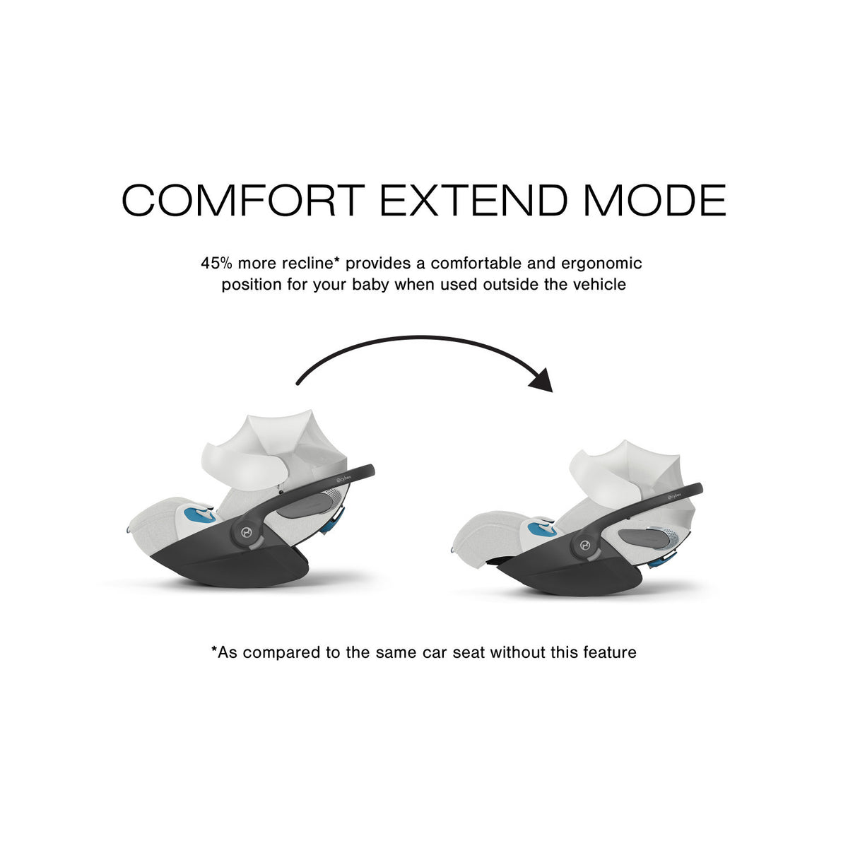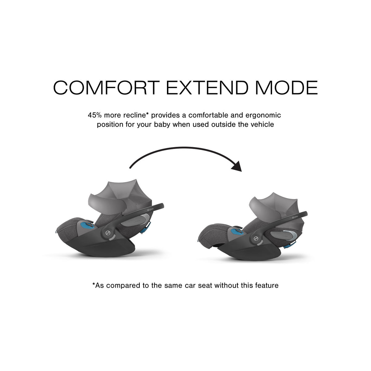 - COMFORT MODE: 45% more recline* for a comfortable and ergonomic position when used outside the vehicle ( *As compared to the same car seat without this feature )