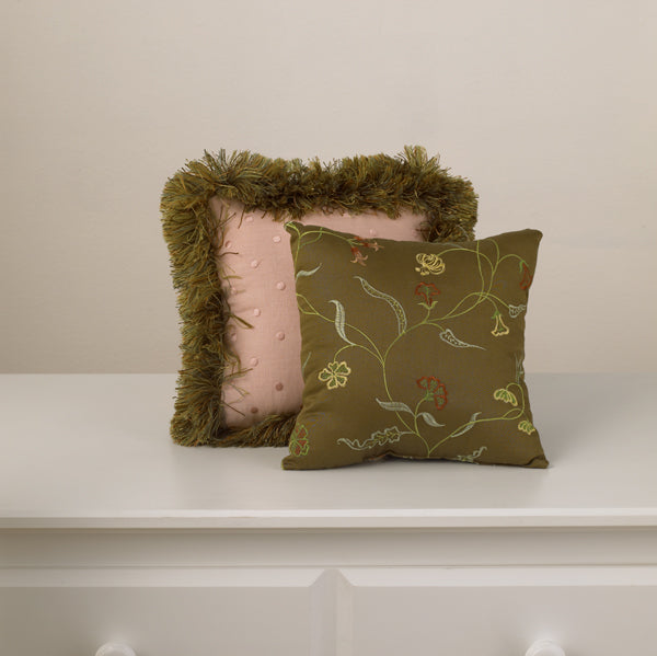 The Cotton Tale Designs Taffy Pillow Pack will complement the Taffy baby bedding set. One of pink dot with brown fringe and the other of brown floral.