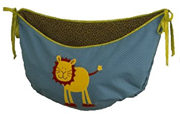 The Cotton Tale Paradise Toy Bag is lined in brown animal print, features a happy yellow lion appliquéd on the front, and trimmed in bright green, is perfect for your little one's favorite playthings.