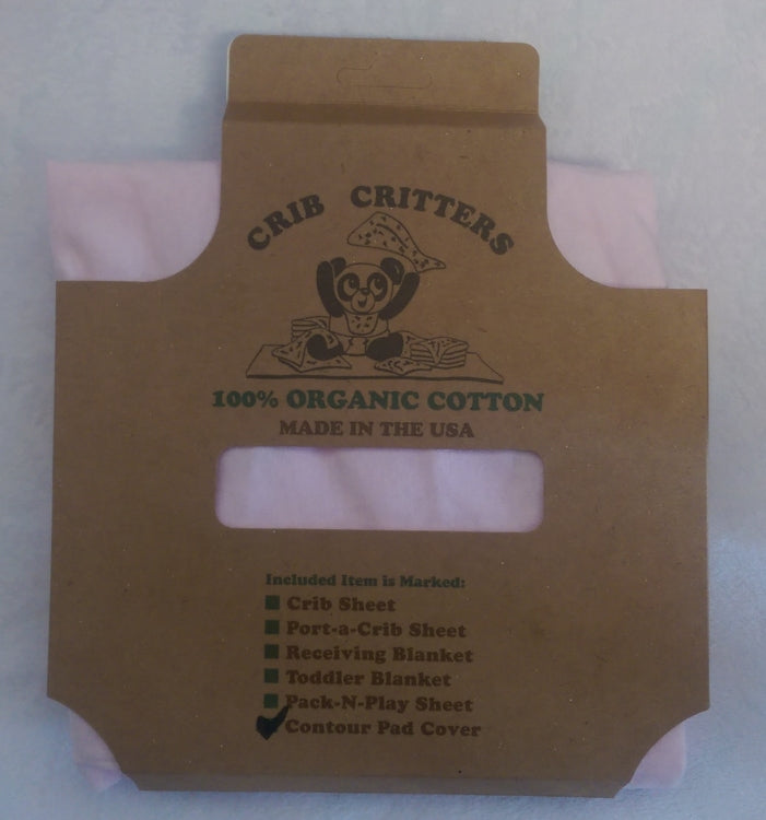 The Crib Critters 100% Organic Contour Changing Pad Cover, Pink are designed with a deep pocket and continuous elastic around the cover for a comfortable fit over different contour pad thicknesses. Machine wash with similar colors, no bleach, tumble dry low, remove promptly. Lead and Phthalate Free. Made in USA.