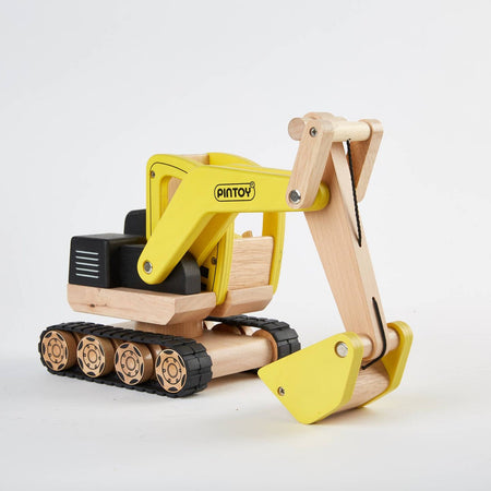 Explore an imaginary construction zone with this sturdy digger.Raise and lower the scoop with chunky controls. Roll forward and backward on treads for even more fun. All PINTOY products are manufactured from sleek wood, with rounded edges for a smooth look and feel. Finished with water-based laquers and tested for quality and durability. Since it was founded in Thailand in 1987, PINTOY has combined beauty, educational value, enjoyment, safety, functionality, and durability. Conforms to all US Safety Standards.