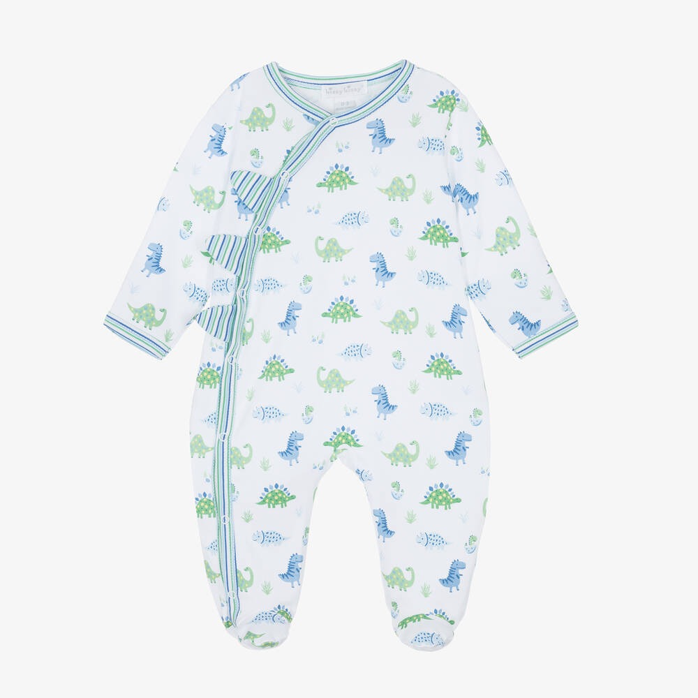Kissy Kissy Footie patterned in a cute dinosaur print in blue and green, with coordinating striped trims. There are poppers for easy fastening and protective fold-over scratch mitts on the smaller sizes.