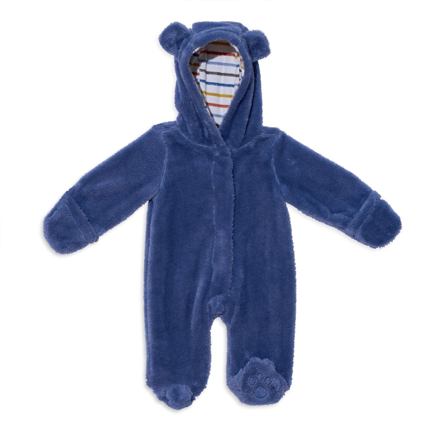Introducing the Magnetic Me Faded Denim Minky Pram. Our little bear suit features our hidden magnetic closures and gets baby ready for cool weather in no time at all! Completely lined from ear to paw in ultra-soft organic cotton for added warmth. Features attached mittens and embroidered bear feet. No reason to hibernate when your cub looks this cute!