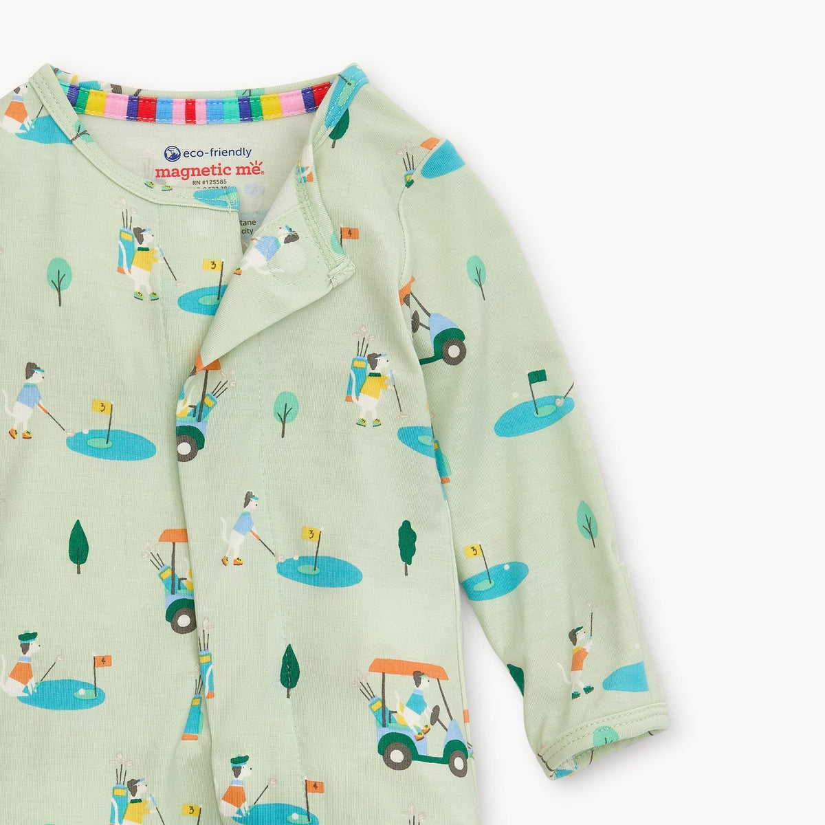 - magnetic closures: magnets line the seam from the neck to upper thigh for sizes up to 0-3m & from neck to crotch for sizes 3-6m and up.