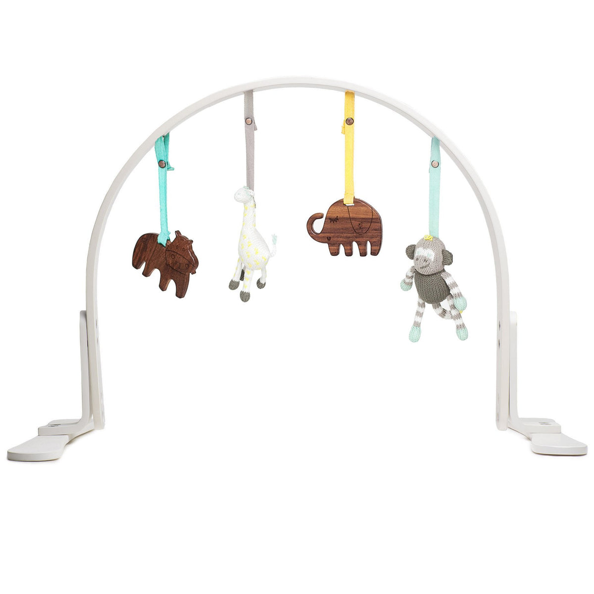 Get ready for the best play date ever! Our height-adjustable Finn + Emma Jungle Play Gym in White has a 100% birch wood frame finished with non-toxic stains and lacquers. The wooden teething toys are made from untreated Indian hardwood and finished with vegetable seed wax. The knit toys were hand-knit at an artisanal women’s collaborative in Peru using G.O.T.S. certified organic cotton yarn. All play gym dolls are removable—they can be used away from the gym as stroller or carseat toys and all of our “Stroller Toys” fit on the gym! Best of all, they’ll never need a ride home at the end of the play date.