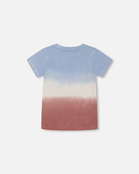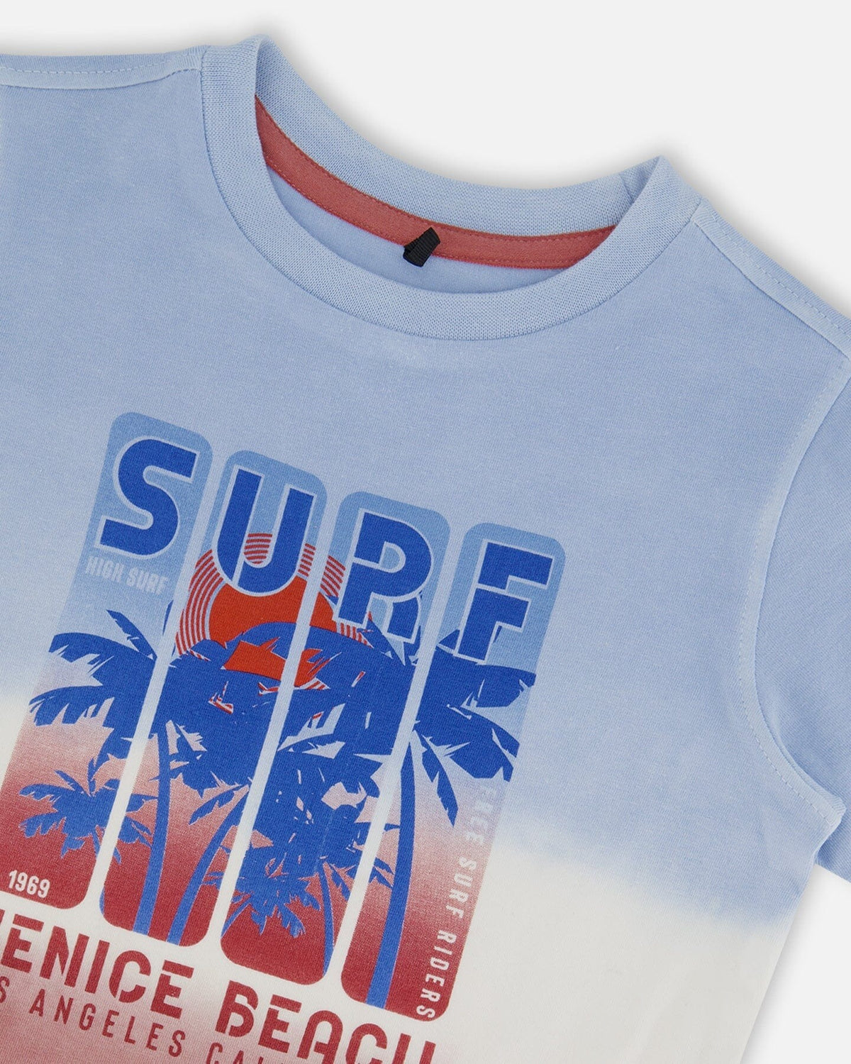 Add a touch of California style to his wardrobe with our Short Sleeve Organic Cotton Graphic Tee Gradient Pale Blue and Dark Old Rose. This tee features short sleeves, a crew neckline, and a bold Venice Beach palm tree print. Team it with any bottom in our Malibu Sands collection for a playful head to toe look!