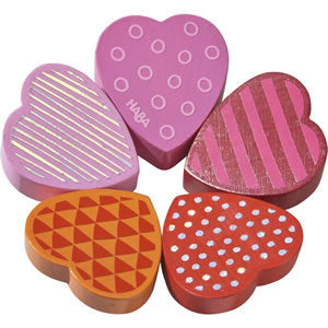 Introducing the Haba Blooming Heart Clutching Toy. Your little love deserves a "hearty" rattle to play with! This solid wood clutching toy features 5 unique heart shapes, strung together on a sturdy cord. Each shape rotates, to mimic that of a flower blooming. Made in Germany and colored with a non-toxic water based stain. Material: beech. Dimensions: ca. 4"