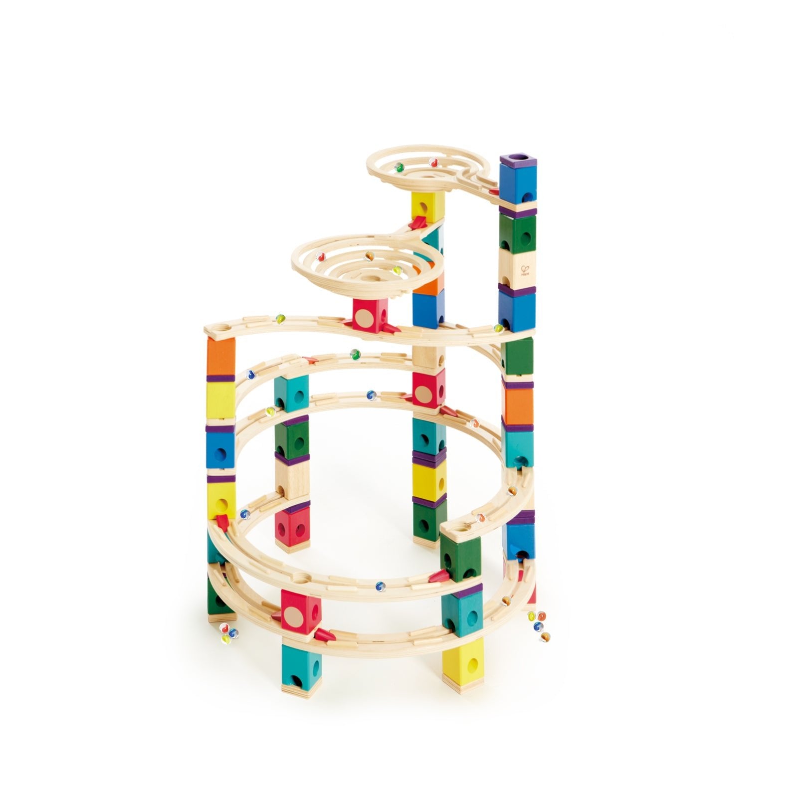 The Hape Quadrilla The Ultimate Set is the largest Quadrilla set. Two spiraling funnels, 12 curved rails, and 10 power-boosting accelerators inspire builders to design the ultimate marble run.