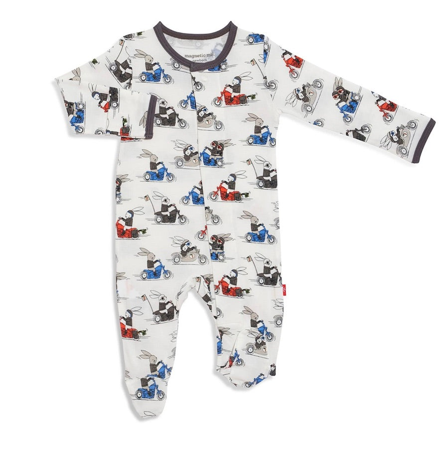 A soft, stylish all-day and all-night wardrobe staple with smart magnetic fasteners that makes changing time painless. With our no over-the-head design, simply open the outfit, insert baby, and BOOM, DONE! - the footie practically closes itself. Machine wash as directed.