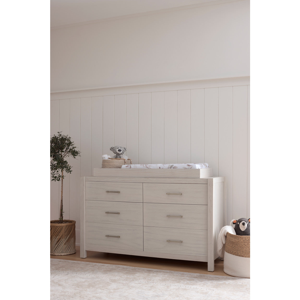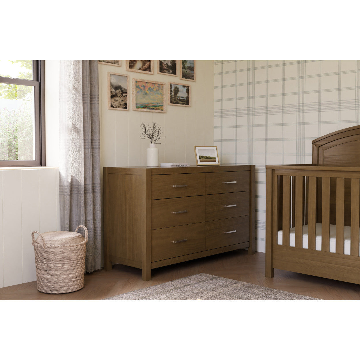 Complete your modern farmhouse nursery with the Namesake Hemsted 6-Drawer Dresser, featuring a premium texturized wood finish and elegant gold hardware that enhances the dresser's contemporary flair. Soft-closing, ball-bearing drawer glides make this dresser easy to use.