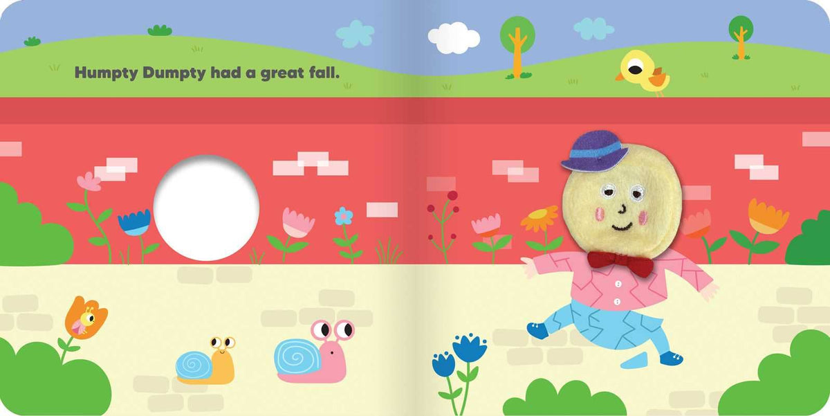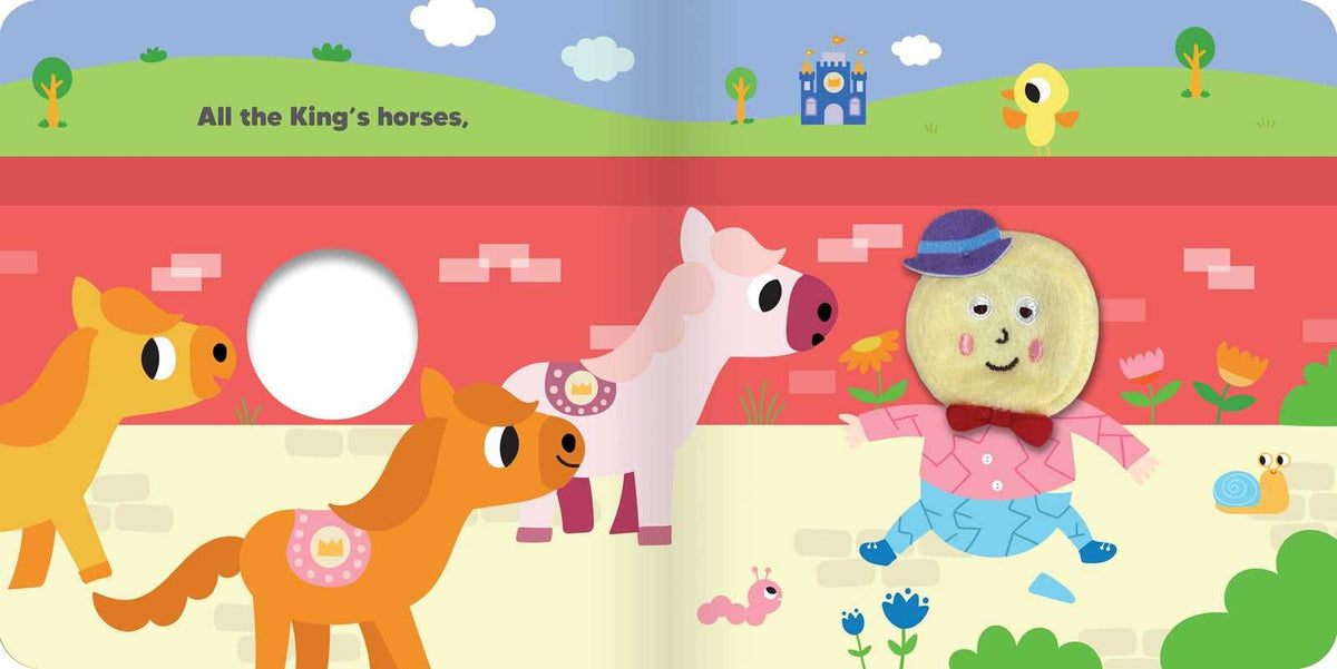 Featuring a soft, plush Humpty Dumpty finger puppet integrated into every page, this interactive book invites children to follow along as Humpty sits on his famous wall. The lively illustrations and familiar rhyme make storytime fun and engaging, perfect for building early language skills and rhythm recognition.