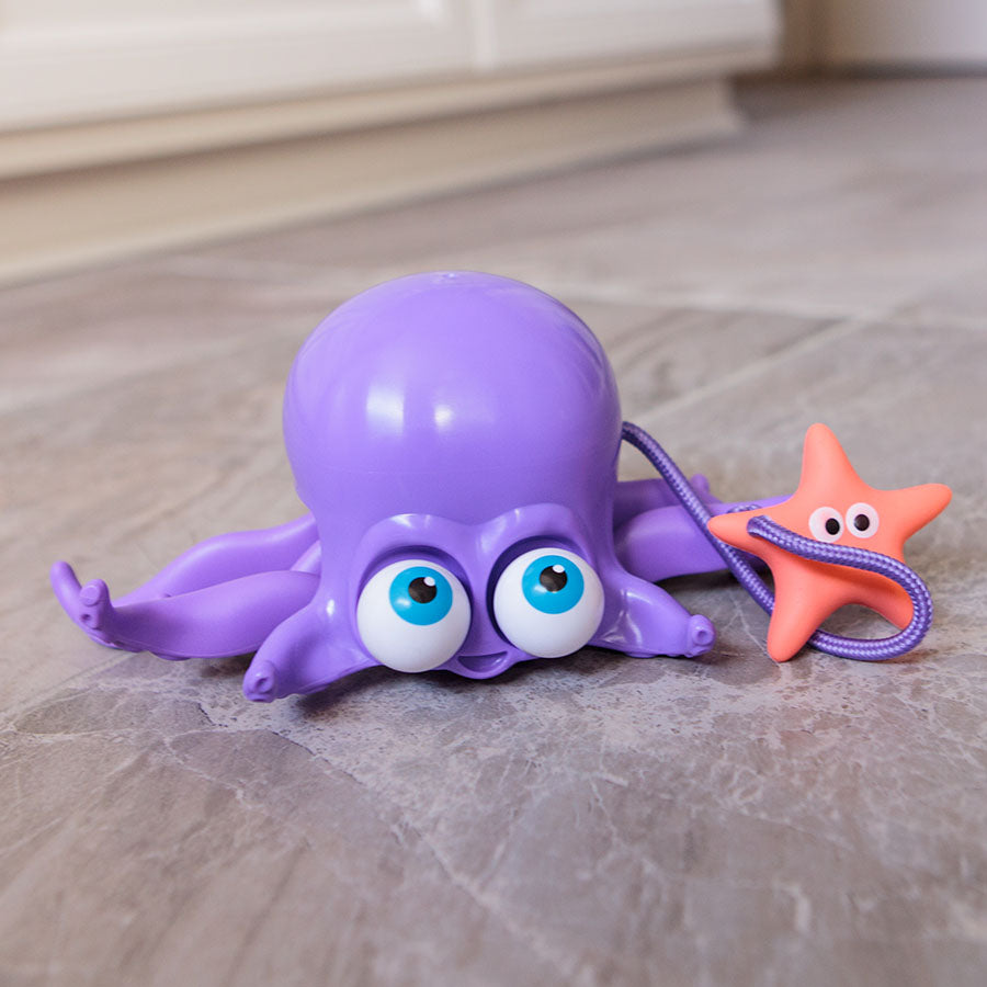 Go on a high-seas adventure with these cleverly crawling sea critters! The tethered silicone star beams with a bright smile, inviting little ones to grab and pull. And when they do - WOW! - Eyes instantly widen with wonder! A big wheel within each critter rolls to makes the legs and tentacles move with amazing life-like motion, all while the friendly eyes playfully bounce back and forth. It's magical motion that's sure to inspire hours of playtime commotion! Discover an ocean's worth of active fun and giggles with the unique and fascinating Crabby & Inky pull toys.