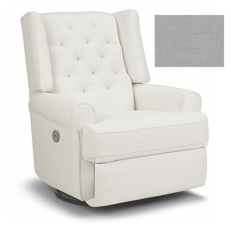 Style meets comfort with the Best Chairs Kendra Power Swivel Recliner - 20993B Fog The fine, made in the USA tailoring is evident with the button tufted back, clean lines, and updated wing back. The size and styling make this recliner ideal for the living room, bedroom, den, or nursery. The gliding base with a 360-degree swivel feature is a functional and relaxing detail. With all these finer points, Kendra keeps one big secret. An inside reclining handle! Kick your legs up after a long day, and recline back for much-needed rest. The Kendra Power Swivel Recliner offers deluxe comfort with a stylish Power button that features a USB charging port.