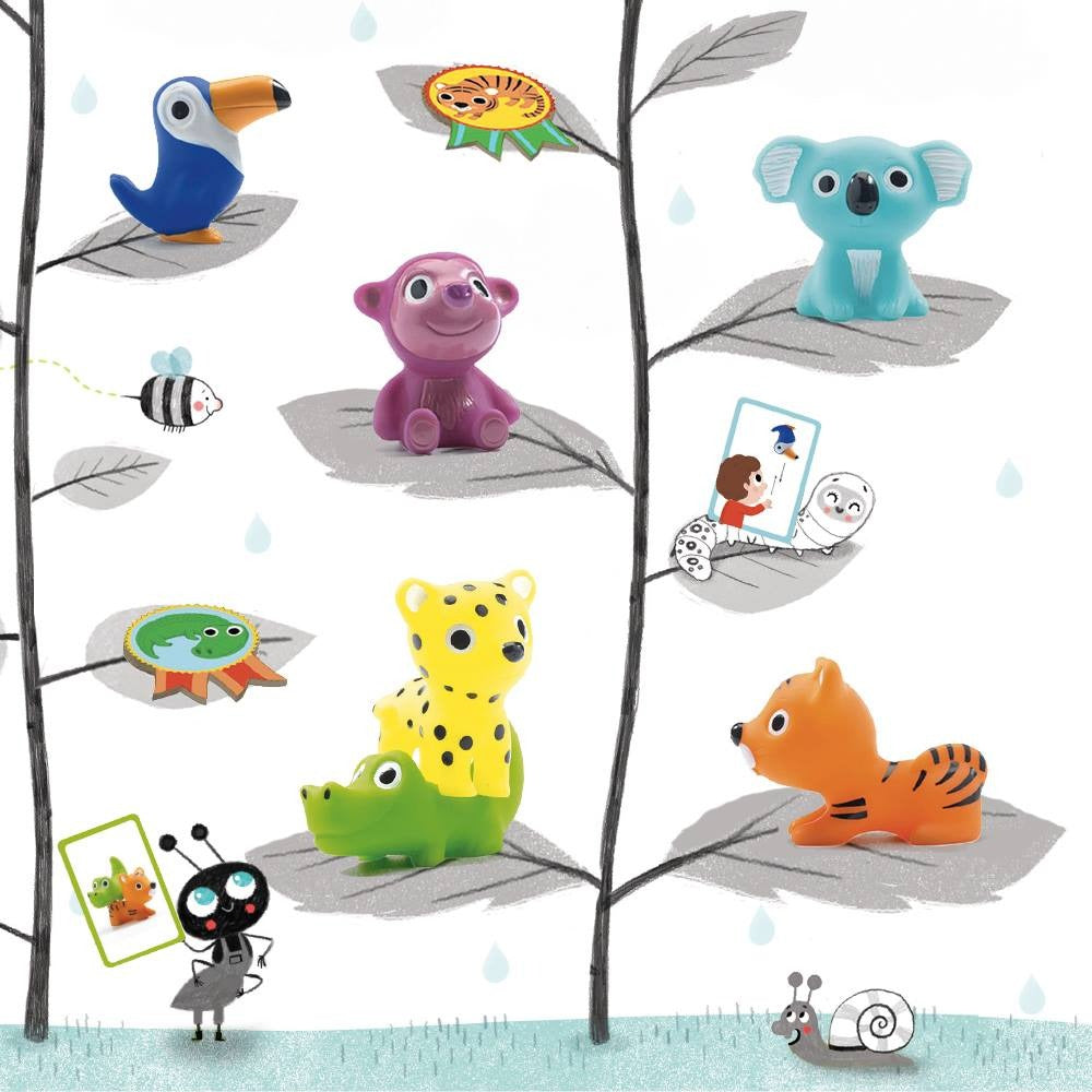 - Contents: 6 soft-touch plastic figures (toucan, crocodile, leopard, monkey, tiger, and koala), 20 challenge cards, and 12 cardboard medals. Game rules in 10 languages.