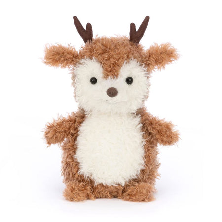 Wonderfully ruffled in toffee and cream, it's Little Reindeer! This sweet pal sits up so proudly, with tufty ears and suedette cocoa antlers. With a beany bottom, button nose and the cutest scruffy hooves, Little Reindeer is a forest treasure.