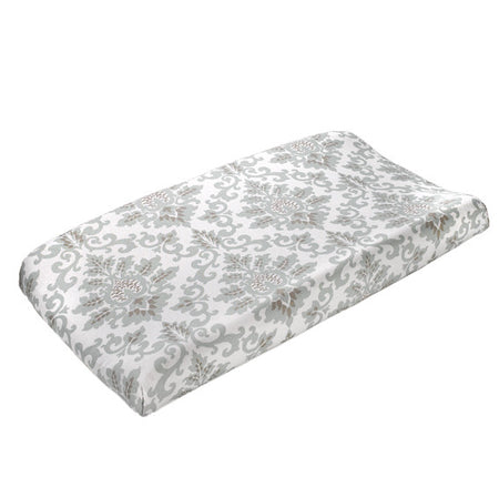 Finish your baby's nursery with a changing pad by Liz and Roo. The Liz and Roo Cecelia Changing Pad Cover is a modern damask-type pattern in gender-neutral or uni-sex colors of flax and gray which coordinate with many of our patterns, including: