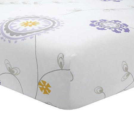 You'll love the ease of care of this soft, cotton twill Liz and Roo Emma Crib Sheet in white with splashes of lavender and sunburst and small hints of taupe/flax and gray. The Emma crib sheet may be our most versatile sheet, coordinating with so many different crib skirts:
