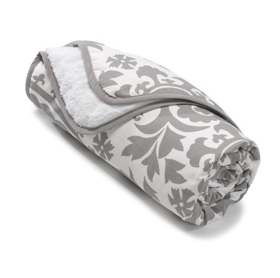 The Liz & Roo Gray Suzani Minky Blanket in Gray Suzani fabric. This 43” x 34” blanket is soft cotton twill on one side reversing to luxurious minky in white, finished with gray banding. Your baby will love being rocked while wrapped in soft minky!