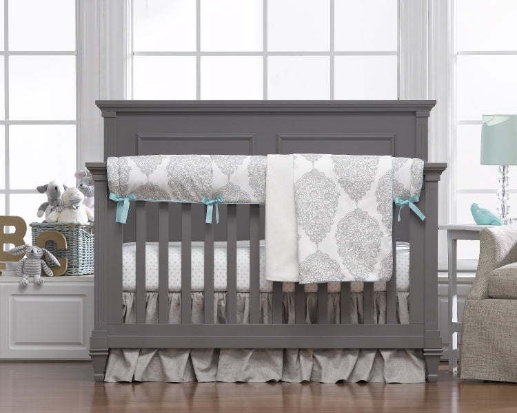 Introducing the Liz & Roo Harper Taupe and Aqua Linen Bumperless Bedding Set ( with ruffled linen skirt ) This pretty design features taupe (an easy gender neutral color that combines tan and gray) with aqua accents and aqua cording and ribbon ties.