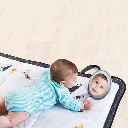 Encourage tummy time by engaging your baby with a variety of activities. Point to the magical illustrations, draw baby's attention to the peek-a-boo tree and satin ribbons, or place the mirror at a convenient angle for your baby to explore his or her own reflection.