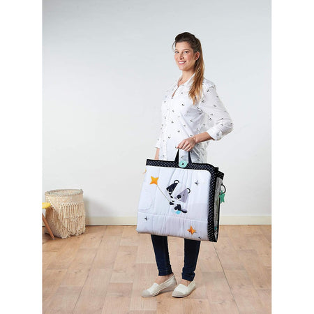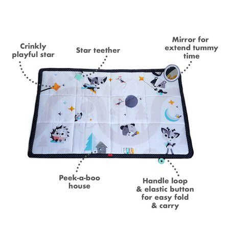When your baby is older and sitting up, let them enjoy the cozy playing area both indoors and outside and explore the mat's various activities.