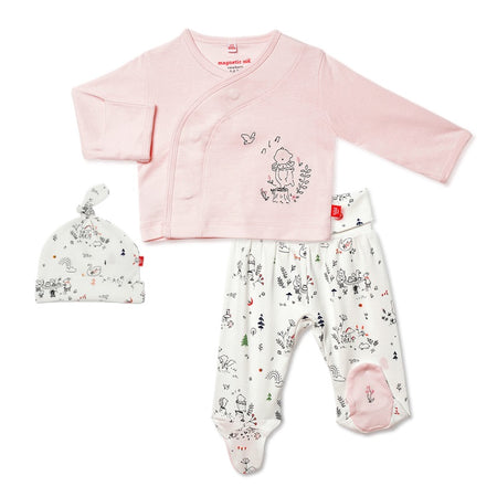 Introducing the Magnetic Me A Friend In Me Kimono - 0-3 Months. Our take-me-home sets protect healing belly buttons and ensure fast, fool-proof changes (for even the newest parents on the block)! Keep baby comfy and cozy at the hospital and at home. Time-saving magnetic fasteners make changes easy as 1, 2, 3. Machine wash as directed.