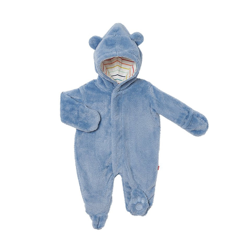 Introducing the Magnetic Me Dusk Blue Minky Magnetic Pram ( multi-stripe liner ) - 9-12 Months. Our little bear suit features our hidden magnetic closures and gets baby ready for cool weather in no time at all! Completely lined from ear to paw in ultra-soft organic cotton for added warmth. Features attached mittens and embroidered bear feet. No reason to hibernate when your cub looks this cute!