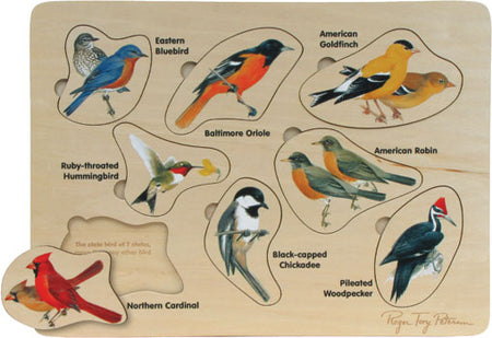 This brightly colored 8-piece Maple Landmark Peterson Backyard Birds Puzzle measures 11" X 15". Eight beautifully captured typical backyard birds are featured in this puzzle. "Lift & Learn" - under each bird, engraved on the puzzle, is an interesting fact about that bird. The printed images won't scrape or wear off. Crafted from 1/8" thick, high quality birch plywood with laser-cut pieces for precision fit. Shipped shrink wrapped. A perfect beginner puzzle for your favorite birder.