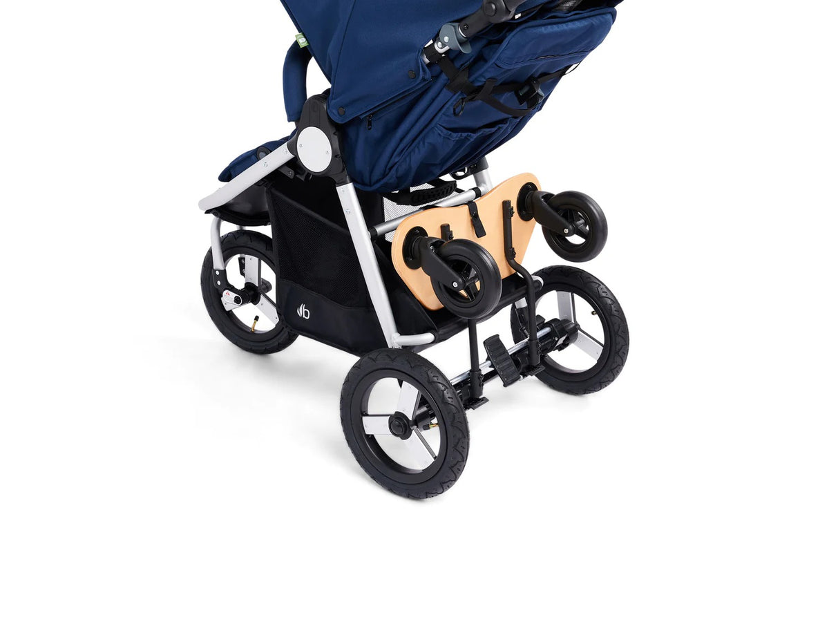 A skateboard-style toddler board with a slip resistant deck. The Mini Board easily attaches to the back of the stroller and offers a fun, “I’m a big kid” ride along experience. This new, improved version allows you to fold and stow the board when not in use with just a few snaps. The stroller is foldable with the board attached.
