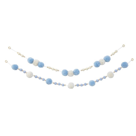 The Mud Pie Blue Pom Pom Garland features large acrylic pom-pom garland on cotton cording features wooden and boiled wool beads.