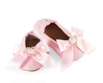 The Mud Pie Pretty in Pink Satin Bow Shoes are genuine leather shoes with Elasticized Ankle, Satin Bow and Jeweled Heart Accent.
